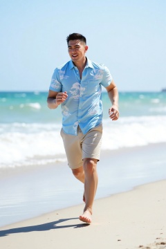 On the beach by the sea, the gentleman is wearing a light blue Hawaiian shirt with white wave patterns printed on it, paired with a khaki casual short. Barefoot, he is running against the sea breeze, with his hands open, as if to embrace the sea. His hair is a little messy by the wind, and his face is filled with a free and happy smile. The sunlight shines on him, outlining his healthy and energetic silhouette. Not far away, the waves are lapping against the beach, creating layers of white foam, forming a vibrant seaside picture with his dynamic figure.