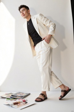 At the fashion magazine shooting site, the gentleman changes into a set of off-white casual formal wear. The loose suit jacket has a unique wrinkled design. With a simple black T-shirt inside, it breaks the dullness of traditional formal wear. He is half-leaning against the white background wall, with one foot touching the ground and the other knee bent. His hands are in his pockets, looking up slightly, with a smile on his lips. His eyes are unruly and casual. The sunlight shines from one side, creating a contrast between light and shade on him, highlighting the three-dimensional sense. Several fashion magazines are scattered beside him, showing the unique charm under the collision of fashion and personality.