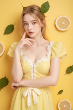 The image is an illustration of a girl with blonde hair and a green leaf on her head. She is wearing a yellow dress with white lace trim and a white ribbon tied around her waist. The dress has a sweetheart neckline and short sleeves. The girl is standing in front of a yellow background with lemon slices scattered around her. She has a thoughtful expression on her face and her hand is resting on her chin, as if she is deep in thought. The overall style of the illustration is cute and whimsical.Realism, photo, artistic photo