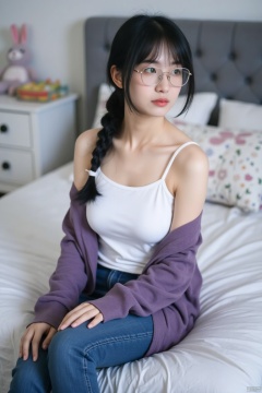 A photo with a sense of atmosphere,a young Asian woman is seated on a bed. She is dressed in a white tanktop, a long-sleeved purple cardigan, and blue jeans. Her hair is pulled back in a ponytail, and she is wearing a pair of eye glasses. Her lips are painted pink, and her eyes are a piercing green. The bed she is sitting on is adorned with white sheets and pillows, and a gray headboard is visible in the background. To the left of the bed is a white dresser with a stuffed bunny on it.