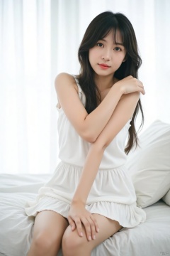 A photo with a sense of atmosphere,a young Asian woman with long dark brown hair and blue eyes is seated on a white bed. She is wearing a white sleeveless shirt with a white ruffled skirt. Her left hand is draped over her right shoulder. Her right hand is resting on her right arm, adding a touch of balance to her body. The backdrop is a stark white wall, with a sheer curtain at the top of the frame