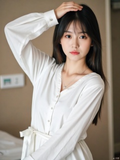 A photo with a sense of atmosphere,a young Asian woman stands with her back to the camera. She is wearing a white long-sleeved button-down shirt, adorned with a white ribbon tied around her waist, and a silver necklace. Her hair is dark brown, and her eyes are a piercing blue. Her left hand is raised above her head, while her right hand is resting on her head. The backdrop is blurred, with a light brown wall and a white light switch visible in the background.