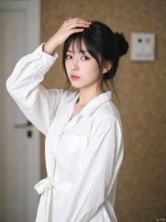 A photo with a sense of atmosphere,a young Asian woman stands with her back to the camera. She is wearing a white long-sleeved button-down shirt, adorned with a white ribbon tied around her waist, and a silver necklace. Her hair is dark brown, and her eyes are a piercing blue. Her left hand is raised above her head, while her right hand is resting on her head. The backdrop is blurred, with a light brown wall and a white light switch visible in the background.