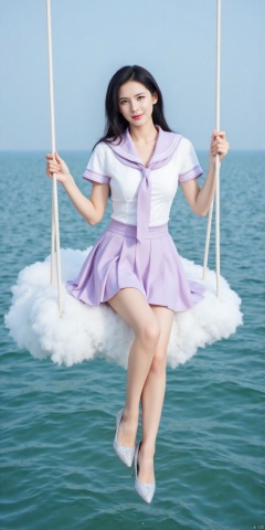 真人肌肤纹理, 4K画质,完美身材,long legs,big_breasts,navel,kind smile,Film texture, film and television, surrealism, a girl with a delicate face is sitting on a cloud swing. The girl is wearing a jk sailor uniform, a white short-sleeved shirt, light purple stripes trimming, a light purple tie, white purple pleated skirt, exquisite diamond-encrusted high heels, swing rope The sub is connected to a cloud in the sky, the background is a vast ocean, the water shows a consistent blue-green tone, the sky is also blue-green, blending with the ocean, perfect light and shadow, hyper-realistic photography, sharpening, artistic conception, Consciousness, large areas of blank space, sense of space, haziness, dreams, fog,