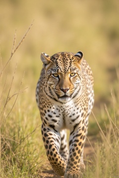 Captured at eye-level on a sunny day, a leopard stands in a field of tall grass. The leopard's fur is a mix of brown and black spots, and its eyes are a piercing yellow. The background of the leopard is blurred, and the grass is a blend of green and brown, and there are a few wispy twigs in the background.