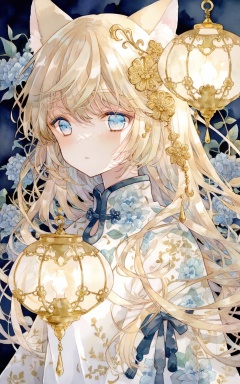 watercolor,transparent,dynamic_outline,Nai3 style,1girl,anime-style character,anime character,gold accents,long blonde hair,cat ears,intricate designs,floral patterns,blue eyes,chandeliers,lanterns,