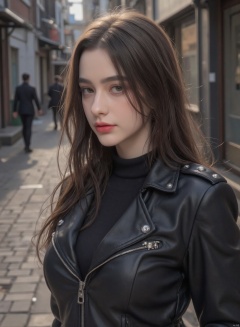 A beautiful and youthful Chinese model, 19 years old, showcases her striking looks with a slender body, perfect face, exquisite eyes, and luscious lips., A photorealistic portrait depicting a mysterious woman with compassionate green eyes and raven-black hair cascading down her back. She sports a dark, fitted leather jacket adorned with intricate silver studs, hinting at a hidden toughness beneath her ethereal beauty. The scene is captured from an unconventional perspective, as if seen through the lens of a small insect, which adds depth and intrigue to her enigmatic gaze. The background is a blend of soft, ambient light filtering through the dimly lit alleyway, casting long shadows that create an atmosphere of suspense and allure around this captivating subject.