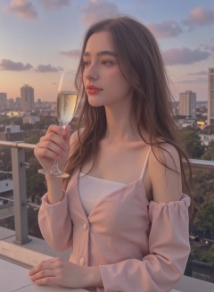 A sophisticated outdoor photograph of a model with elegant dark hair and a flawless complexion, wearing a chic summer suit, enjoying a glass of champagne at a rooftop bar overlooking a vibrant cityscape at sunset. The city lights twinkle in the background, creating a glamorous atmosphere. High resolution, 8k, golden hour lighting, hyperrealistic, photorealistic, detailed textures, shallow depth of field, lifestyle photography, advertisement photography, summer fashion, luxury lifestyle, trending on artstation.
