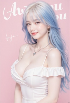 1girl, solo, long hair, breasts, cleavage,looking at viewer,Smile gently, pink background, blue hair,Air bangs,Thick hair, dress, cleavage, bare shoulders, jewelry, medium breasts, white hair, upper body, earrings, parted lips, signature, necklace, off shoulder, white dress, lips, It says "love you" on the top of the cover in Englishrealistic