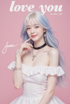1girl, solo, long hair,,looking at viewer,Smile gently, pink background, blue hair,Air bangs,Thick hair, dress, bare shoulders, jewelry, white hair, upper body, earrings, parted lips, signature, necklace, off shoulder, white dress, lips, It says "love you" on the top of the cover in Englishrealistic,black collar