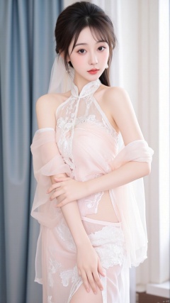 The image is a portrait of a young woman wearing a traditional Chinese dress. The dress is a light pink color with intricate white lace detailing on the bodice and skirt. The neckline is halter-necked and the dress has a high slit on the side. The woman is standing in front of a window with blue curtains, and she is posing with one hand on her hip and the other resting on her thigh. She has long dark hair styled in loose waves and is looking directly at the camera with a serious expression. The overall mood of the image is elegant and sophisticated.