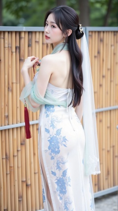 The photo shows a young woman standing in front of a bamboo fence. She is wearing a long flowing white dress with a blue and white floral pattern. The dress has a high neckline and long sleeves. She has long black hair with a loose wavy hairstyle and is holding a sword with a red tassel hanging from the hilt. The woman is looking to the side with a serious expression on her face. The background is blurry but looks like a garden or park with trees and greenery.