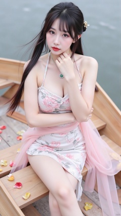 The picture is a portrait of a young woman sitting on a wooden boat. She is wearing a pink dress with a floral pattern, wearing a necklace, and her long black hair is designed in a loose wavy shape. She looks straight at the camera with a serious expression. The boat is scattered with various petals, and the background is the West Lake. The overall artistic conception of the picture is elegant and exquisite.