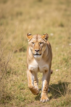On a sunny day, a lion stood on a high grassy field. The lion's fur is clear, and its eyes are glaring yellow. The background is blurry, the grass is a mixture of green and brown, and there are some small branches in the background.