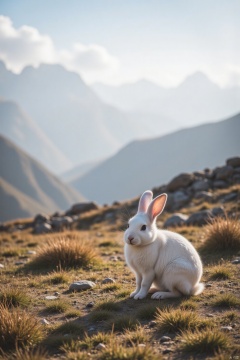 A majestic Tibetan Rabbit perched on a windswept plateau, against a backdrop of towering Himalayan mountains and wispy clouds. Soft golden light casts long shadows across the rugged terrain, as the rabbit's gentle gaze meets the camera, its fluffy fur ruffled by the crisp mountain air.