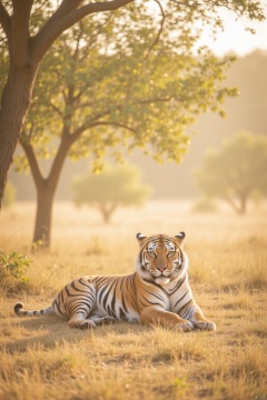 A majestic tiger (老虎) lies sprawled across a sun-drenched savannah, its tawny coat glistening in warm afternoon light. Framed by a cluster of acacia trees, the big cat's piercing gaze seems to pierce through the haze, as it lazily blinks and stretches out its powerful limbs.