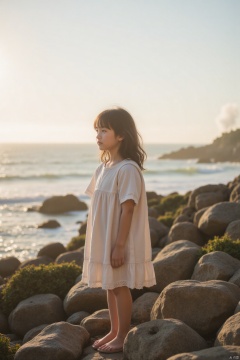 A young girl stands alone on a rocky coastline, her gaze fixed on the distant horizon where the sea meets the sky. The warm sunlight casts a golden glow on her features as she waits patiently for something or someone. The air is filled with the sweet scent of saltwater and seaweed. In the distance, a faint mist rises from the ocean, creating a sense of depth and mystery.