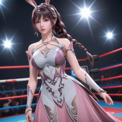 (upper_body:1.1),(huge breasts:0.9),<lora:YQponyxiaowuV8:0.8>,(q1528437228:1.5),1girl,solo,dress,long hair,rabbit ears,animal ears,ponytail,brown hair,hair ornament,pink dress,black hair,jewelry,bare shoulders,metal collar,necklace,braid,collar,high heels,brown eyes,blush,(looking_at_viewer:1.1),BREAKintricate details,shiny_skin,solo focus,(blurry background:1.1),(depth of field:1.1),perfect_anatomy,(cinematic lighting:0.9),(volumetric lighting:0.9),light rays,shiny clothes,light beam,hourglass,(Short torso:1.1),(High waistline:1.1),(wrestling_ring,:1.2),