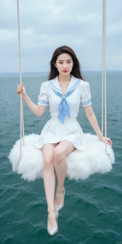 真人肌肤纹理, 4K画质,完美身材,long legs,big_breasts,navel,kind smile,Film texture,kind smile, film and television, surrealism, a girl with a delicate face is sitting on a cloud swing. The girl is wearing a jk sailor uniform, a white short-sleeved shirt, light blue stripes trimming, a light blue tie, white blue pleated skirt, exquisite diamond-encrusted high heels, swing rope The sub is connected to a cloud in the sky, the background is a vast ocean, the water shows a consistent blue-green tone, the sky is also blue-green, blending with the ocean, perfect light and shadow, hyper-realistic photography, sharpening, artistic conception, Consciousness, large areas of blank space, sense of space, haziness, dreams, fog,