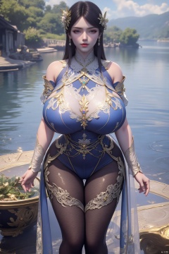 blue and white porcelain long cheongsams,There are white patterns on the clothes on the chest,There are jewels on the clothes on the chest,