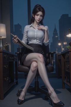 A professional woman with black hair tied into a ponytail. She looked like a young girl who had just grown up, with a small figure. She was wearing a white shirt and a black ultra-short pleated skirt. Her huge breasts barely fit under her clothes. Wearing silk garters, she sat restrainedly on an office chair, covering her breasts with one hand, holding a folder on her knees with the other, looking at the audience, with long, beautiful legs and black high heels. The background is an office with desks, chairs, night, dark blue atmosphere, dim lights, blurred background, dynamic poses, shot from a very low angle. Shot from the front and below, looking up, bug-eye lens.