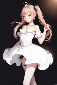 Realistic style, cinematic work, 8K wallpaper, masterpiece, very realistic quality, best quality, masterpiece, high-level, high-resolution,,,Edge lighting, dual tone lighting, soft lighting, The illuminated surface of the material has bright spots and highlights, which flicker and have a mirror effect when reflected, There are sparkling spots on the armor,,,1 girl, mature female, solo, full body, looking at viewer, lace, strong rim light, Standard proportion of female body, golden proportion of female body,,,Standing, standing posture, Sexy full body standing posture,,,,(zexi, 1girl, red hair, twintails, low twintails, blush, yellow eyes, ahoge, bangs, hair ornament, crown, long hair, mini crown, floating hair, earrings,white dress, white pantyhose, sleeveless, breasts, shoes, bare shoulders, black bow, bow, small breasts, outstretched arm, frills, white thighhighs, puffy sleeves, thighhighs, detached sleeves, dress, pantyhose, black footwear,:1.2),,bare shoulders, off shoulder, black hairband, bikini bottom only, short dress, swimsuit, pleated dress, bikini, floating hair, blush, ass visible through thighs, skirt,White high-heeled shoes,:1.2),,,colorful,(detailed skin: 1.3), (detailed face: 1.3),clear focus,delicate,(mature women: 1.2),(glossy skin+glossy skin: 1.4),(sweating: 1.1),(big_eyes),red_ eyeshadow,long_ Eyelashes, red lips,,,simple background, grey background,,,(Diamond hair accessories, diamond necklaces, diamond earrings, diamond earrings, clothes embedded with diamonds, armor embedded with diamonds,:1.3), huoqiangshou<lora:EMS-325739-EMS:0.320000>