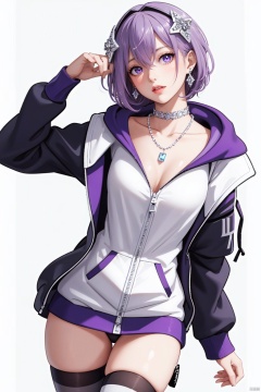 Realistic style, cinematic work, 8K wallpaper, masterpiece, very realistic quality, best quality, masterpiece, high-level, high-resolution,,,Edge lighting, dual tone lighting, soft lighting, The illuminated surface of the material has bright spots and highlights, which flicker and have a mirror effect when reflected, There are sparkling spots on the armor,,,1 girl, mature female, solo, full body, looking at viewer, lace, strong rim light, Standard proportion of female body, golden proportion of female body,,,Standing, standing posture, Sexy full body standing posture,,,,(HDN101, 1girl, purple eyes, purple hair, hair ornament, short hair, blush, hair between eyes,thighhighs, striped, hood, choker, striped thighhighs, jacket, long sleeves, hooded jacket, boots, hooded track jacket, hoodie, zipper, white choker,:1.2),,bare shoulders, off shoulder, black hairband, bikini bottom only, short dress, swimsuit, pleated dress, bikini, floating hair, blush, ass visible through thighs, skirt,White high-heeled shoes,:1.2),,,colorful,(detailed skin: 1.3), (detailed face: 1.3),clear focus,delicate,(mature women: 1.2),(glossy skin+glossy skin: 1.4),(sweating: 1.1),(big_eyes),red_ eyeshadow,long_ Eyelashes, red lips,,,simple background, grey background,,,(Diamond hair accessories, diamond necklaces, diamond earrings, diamond earrings, clothes embedded with diamonds, armor embedded with diamonds,:1.3)<lora:EMS-324609-EMS:0.260000>