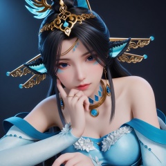 (upper_body:1.1),(huge breasts:0.9),76.<lora:YQponybiboxianziV2:0.8>,(q1528437228:1.3),1girl,solo,jewelry,black_hair,long_hair,hair_ornament,bare_shoulders,dress,necklace,blue_dress,earrings,animal_ears,anklet,brown_hair,long_sleeves,blue_hair,detached_sleeves,gem,head_fins,crown,elbow_gloves,feathers,frills,,blush,(looking_at_viewer:1.1),BREAKintricate details,shiny_skin,solo focus,(blurry background:1.1),(depth of field:1.1),perfect_anatomy,(cinematic lighting:0.9),(volumetric lighting:0.9),(simple background,pure black background,black background:1.1),