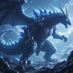 The Golden Horned beast,one horned,Godzilla,A pair of large wings,Glowing eyes,monster,enormous, best quality, extremely detailed, dynamic angle, atmospheric, full body lens,highdetail,futuristic,sciencefiction,blue fantasy,masterpiece,CG,