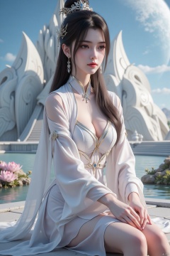 A beautiful woman is sitting on a lotus platform,squinting her eyes and casually placing her hands on her knees. She wears a Taoist headdress on her head and a white translucent veil on her body,with a serene expression on her face. Her outer garment has an open collar,and her skin texture is clear with exquisite details. The background is a super large futuristic ancient building that combines modern metal and glass technology. There is a planet in the background.,