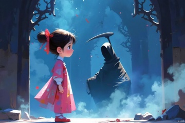 A whimsical cartoon scene unfolds: a young girl, Guanghui's vibrant colors radiating from her bright pink dress and matching bow, stands confidently before a dark silhouette of Death, shrouded in eerie blue mist. Her expressive face, outlined in bold black lines, conveys determination as she converses with the Grim Reaper, who looms behind a vector-style frame of ornate Gothic arches, the color trace effect giving the scene a dreamlike quality.