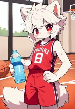 solo,male focus,(white hair,red eyes),indoors,basketball court,looking at viewer,red sleeveless,red shorts,sweat,one hand on hip,holding water bottle,hand on hip,depth of field.,body fur,furry,