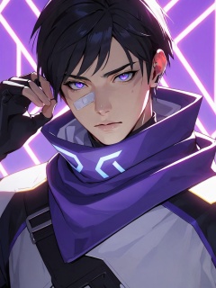 Iso,1boy,male focus,purple eyes,solo,bandaid,bandaid on face,gloves,fingerless gloves,this is a digital anime-style illustration featuring a serious young man with short black hair,pale skin,and striking blue eyes. he wears a white and black futuristic outfit with a high collar,black gloves,and a red scarf. he has a bandage on his cheek. the background is a glowing,geometric,purple and white pattern,creating a sci-fi atmosphere. the depth of field is shallow,with the background slightly blurred. no watermark is present.,looking_at_viewer,real,ray tracing,ultra sharp,ultra high resolution,(masterpiece),(best quality),super detailed,extremely delicate and beautiful,exquisite facial features,super delicate face,cinematic light,detailed environment,ultra realistic details,facing camera,finely detailed features,cinematic lighting effects,photoreal,32k uhd,cinematic lighting effects,