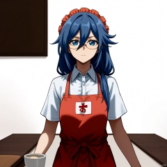 (masterpiece:1.3),(the best quality:1.2),(super fine illustrations:1.2),(Masterpiece),high quality,high detail,(white background:1.2),looking at viewer,(SOLO:1.4),outline,simple background,upper body, cowboy shot,looking at viewer,(((arms at side))),  fu hua animever,fu hua,long hair,bangs,blue eyes,grey hair,blue hair,hair ornament,hair between eyes, ponytail,low-tied long hair, grey hair, blue hair, hair between eyes, low-tied long hair,glasses, apron, shirt, white shirt, blue eyes, bangs, fu hua, pink apron, collared shirt