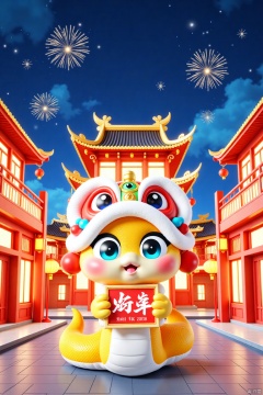 xinniankeai,This vibrant digital illustration depicts a traditional Chinese holiday night, with an adorable, Chinese-style anthropomorphic snake character in the middle of the frame celebrating the Chinese New Year. The character has large, expressive blue eyes, a fluffy white hat with red and blue ornaments, and festive attire against a backdrop of a brightly lit, ornate temple with red lanterns, gold ornaments, and a pagoda-like roof. Fireworks burst in the starry sky, casting a festive glow, and the clean and tidy streets add to the lively atmosphere. The painting is rich in detail and color, capturing the essence of the joyous celebration.
