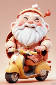 xinniankeai,This is a vibrant CGI illustration featuring a joyful, chubby, elderly Asian man with a long white beard and mustache, riding a bright yellow scooter. He wears a traditional golden-yellow and red robe adorned with intricate patterns and a floral headdress. His eyes are closed, smiling widely. Pink cherry blossom branches with white flowers are attached to the scooter. The background is a warm, gradient red with bokeh light effects. The image exudes a festive, celebratory atmosphere, likely inspired by Chinese New Year.