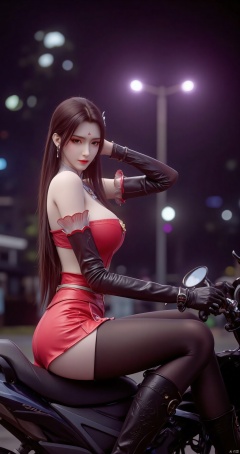 Yamaha R15 black motorcycle, red leather off-shoulder top, red leather shorts, black stockings, red high heels, black choker, black gloves, long hair, night, purple light background, fashion, sexy, leather material, metal decoration, motorcycle Detail, woman, sitting pose, outdoors, blurred background, leaning on motorcycle, body tilted to the left, hands on leather pants slit, black rope, dynamic pose, low angle shot.