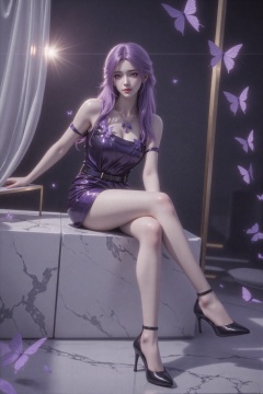 • The clothing design is fashionable, and the purple dress is decorated with butterflies, which adds visual appeal.