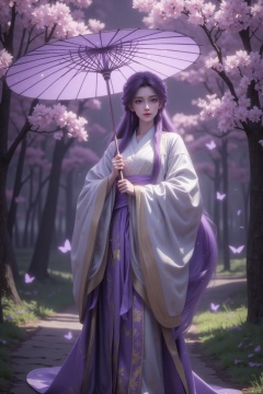• The figure stands, holding a purple umbrella, with an elegant posture.