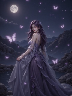 A serene woman with a cascade of purple hair and a flowing purple gown, bathed in the soft glow of moonlight on a quiet night. Her features are illuminated, radiating an aura of mystique. A delicate dance of butterflies flutters around her, adding to the ethereal atmosphere. The composition is centered, with the subject's gentle pose and the fluttering butterflies creating a sense of harmony.zichu