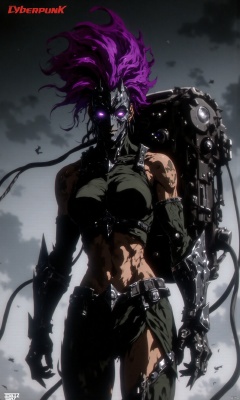In the cyberpunk world, the figure of this woman is remarkable. Her hair has been dyed a bright fluorescent purple, and at the roots, there are implanted data interfaces that flash with cold light.