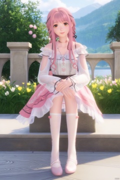 masterpiece, best quality, masterpiece,best quality,official art,extremely detailed CG unity 8k wallpaper,1girl,solo,long hair,looking at viewer,bangs,skirt,long sleeves,dress,brown eyes,jewelry,pink hair,braid,flower,outdoors,frills,necklace,see-through,pink skirt,see-through sleeves,socks,shoes,happy,hugging own legs,(hugging own legs:1.3)