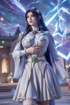 In a surreal photo, a stunning female elf stands out against a vibrant backdrop of a fantasy castle and a swirling nebula. She wears a breathtaking white wedding dress with intricate details, her long black hair cascading down her back like a river of moonlight. The lighting is dramatic, with electric arcs dancing across the sky, casting an otherworldly glow on the scene. In the foreground, the elf's pose is elegant and poised, her shiny pantyhose catching the light as she gazes out into the galaxy. The composition is striking, with a beautiful western-style castle rising up in the background, its stone walls glowing softly under the neon hues of the nebula. The overall effect is one of high-contrast fantasy, where the boundaries between reality and dreams blur seamlessly. She holds a The Hope Diamond between her breasts, her hands on her chest, the cleavage cradling The Hope Diamond with a sense of regal elegance. The camera captures her from a high angle, focusing on her upper body and TheHope Diamond in her cleavage. There is a tattoo under the collarbone,which reads: Fanfu Suzi.,dlls
