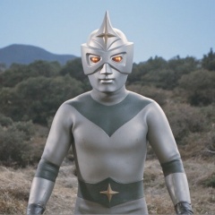Mirrorman,ultraman,silver bodysuit,silver gloves,legwear,gloves,boots,cover,mask,plugsuit,armor,bodysuit,green pattern on body,silver tight-fitting,silver footwear,helmet,leather suit,latex,tokusatsu,no humans,science fiction,silver head,hard mask,no smile,no eyes,no nose,solo,silver rubber bodysuit with green line