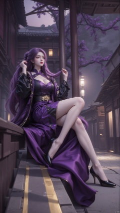 • The clothing design is fashionable, with purple and black cheongsam paired with high heels, adding visual appeal.