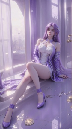 • The character's hair is purple, echoing the purple and white of the costume, and the overall color combination is harmonious.