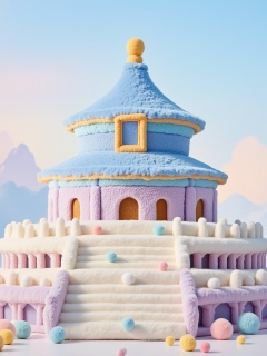 YY_plush,A whimsical and imaginative rendition of the Temple of Heaven made entirely from soft,fluffy plush materials,designed in a LOOPY art style. The iconic round structure is depicted in vibrant yet harmonious pastel tones of baby blue,lavender,and soft gold,with detailed embroidery-like textures for its intricate designs. The white marble-like steps and railings are reimagined as smooth,while the overall composition maintains clean lines and a minimalist atmosphere. The scene is bathed in soft,diffused lighting,enhancing the cozy and magical feel. The background features a clear pastel sky with a gentle gradient,adding to the serene and playful ambiance.,<lora:YY-毛绒F.1:1>,