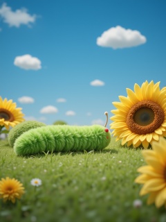 YY_plush,A close-up of a fluffy green caterpillar, lying on a lush green grass. Surrounded by a fluffy sunflower, against the backdrop of a deep blue sky with several leisurely drifting white clouds. High-quality image, intricate details, vivid colors, photorealistic style, ultra-detailed, 8k resolution.<lora:YY-毛绒F.1:1>,