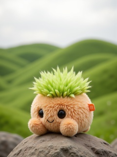 YY_plush,A photograph of a plush toy resembling a small,chubby,tan-colored hill with green grass on top,sitting on a gray rock. The toy has two large,round eyes and a small,orange tag with the word "HM" printed on it. The background features a lush,green hill with rolling waves of grass,creating a serene and natural setting. The sky is overcast,giving a soft,diffused light to the scene. The overall mood is peaceful and whimsical. The photo is taken from a low angle,emphasizing the toy's placement on the rock. The colors are vibrant and the textures are soft and plush.,<lora:YY-毛绒F.1:1>,