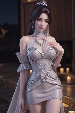 A charming and sexy woman with a graceful figure. She is wearing a Silver grey evening dress and flesh-colored pantyhose.The smooth tailoring perfectly fits her body curves, highlighting her slender waist and charming body contour. The delicate sequins on the dress twinkle with fragmented light under the light, just like the stars in the night sky. The floor - length skirt sways gently with her steps, exuding endless temptation and noble temperament with every step.,